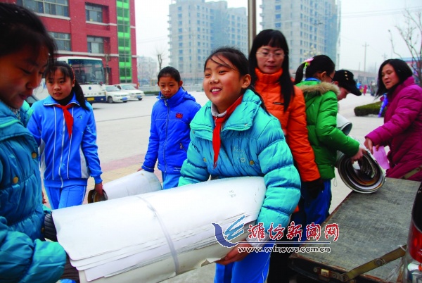 12月29日電12月28日,濰城區(qū)北關(guān)小學(xué)的學(xué)生冒雪為盲童捐出家中的舊掛歷。